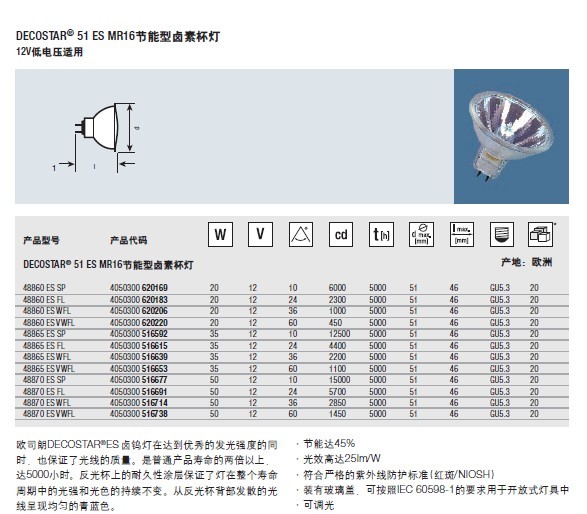 欧司朗48860 ECO FL 12V 20W MR16节能型卤钨杯灯 24度 详情请来电咨询:0752 2210266...