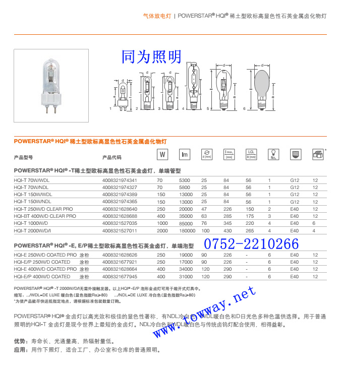 HQI-T 1000W/D欧司朗金卤灯管E40白光产品特性