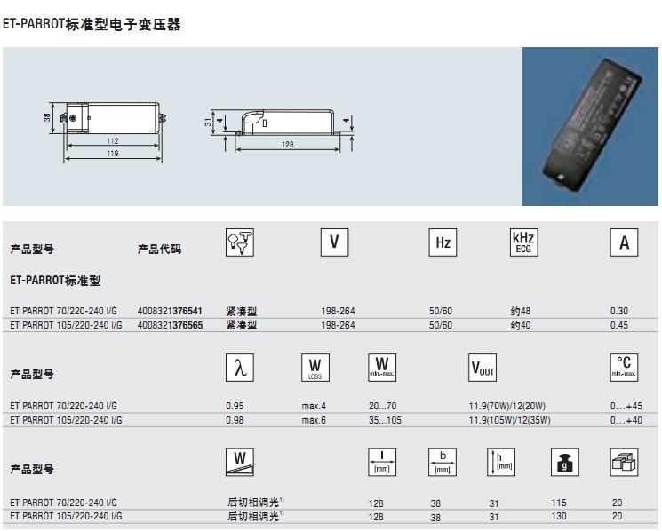欧司朗 OSRAM ET-PARROT 105/220-240 I/G 卤素灯电子变压器/可调光