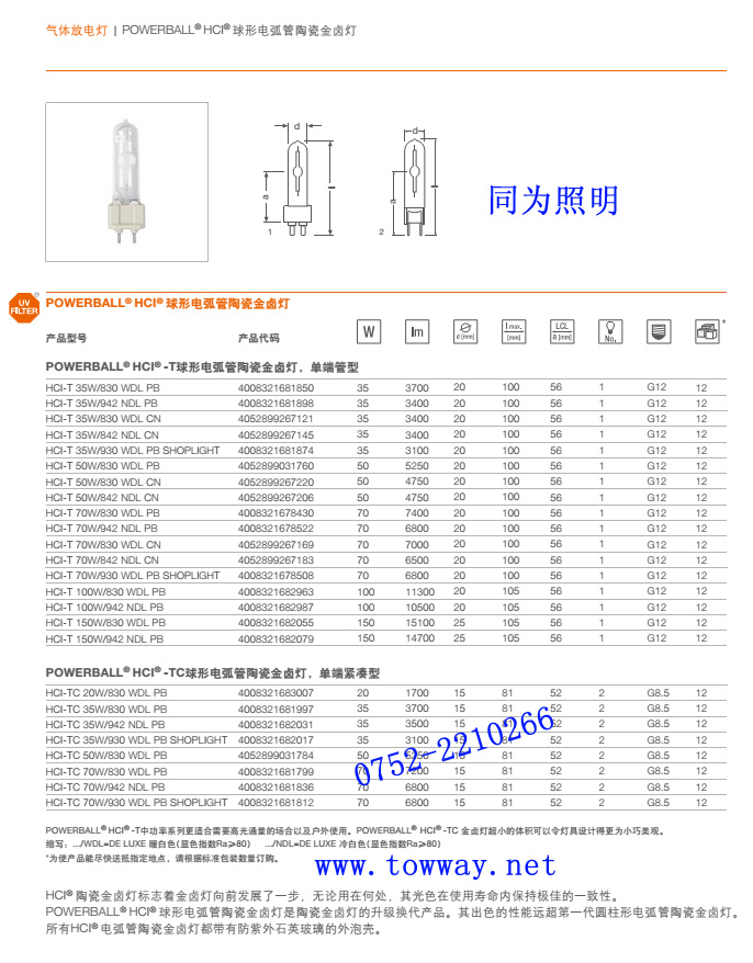 欧司朗OASRM HCI-T 70W/150W/830/942 G12 NDL/WDL 白光/黄光.OSRAM(惠州同为照明)有限公司---是一家专业经销批发OSRAM产品的公司,我司常年提供并大量库...